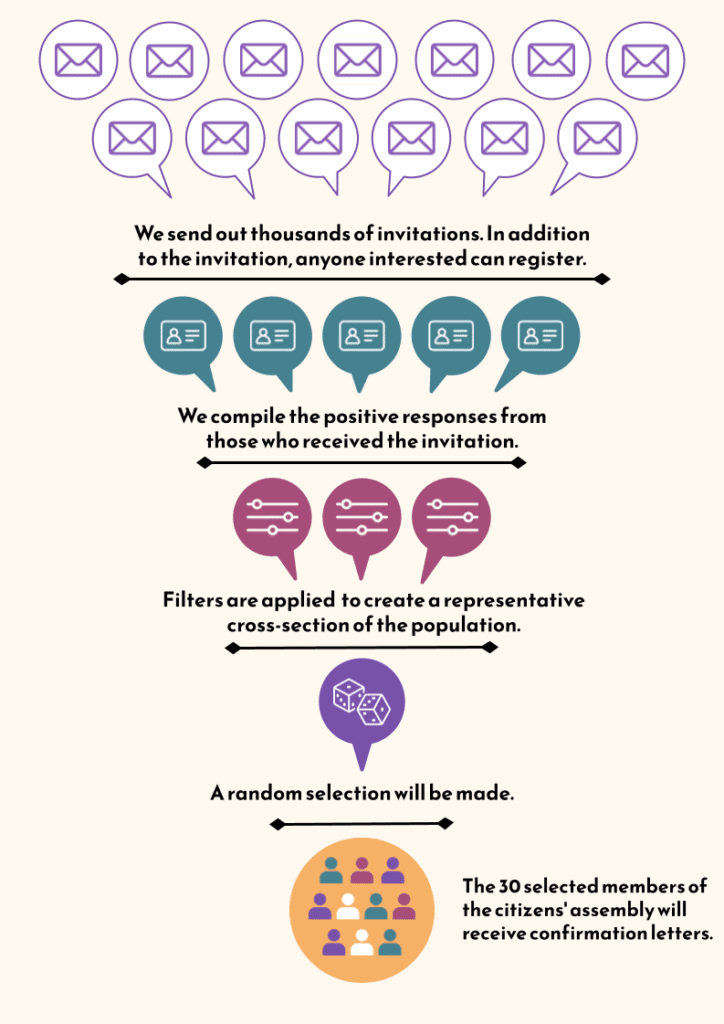 From among all those registered, an algorithm will select the 30 people who most accurately reflect the diverse profile of the population. This approach is called a democratic lottery