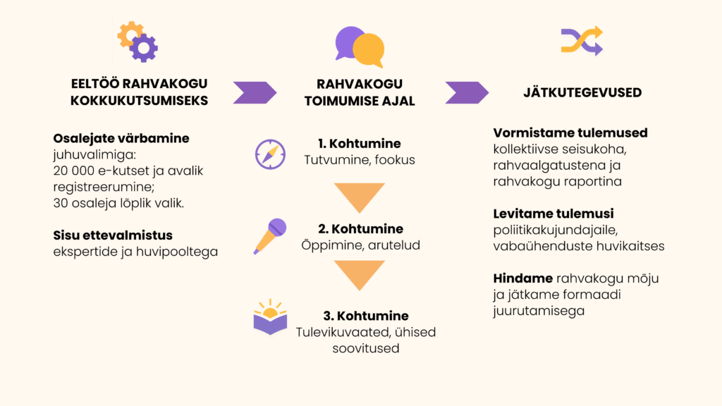 Rahvakogu osalejad kogunevad jaanuaris ja veebruaris 2026, kokku viiel päeval. Iga nädalavahetus toimub eri paigas. Asukohad on valitud selle järgi, et Eesti eri kohtadest pääseks rongi ja bussiga hõlpsasti ligi. Kohtumised toimuvad kogukondlikes ruumides – rahvamajas, kogukonnakeskuses, waldorfkoolis.