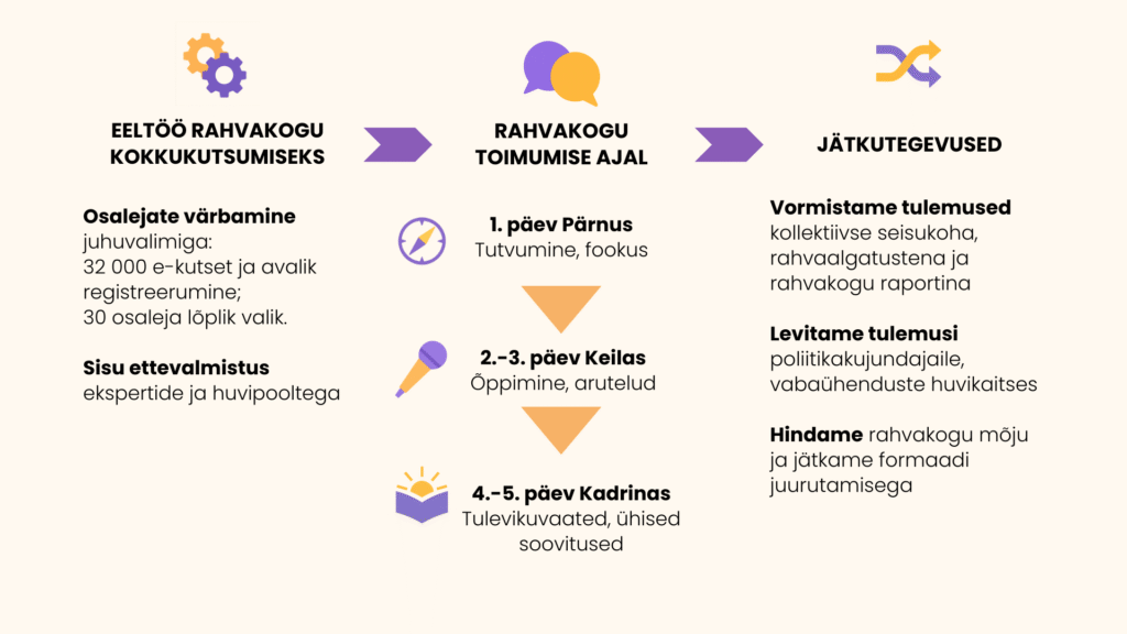 Rahvakogu osalejad kogunevad septembris ja oktoobris 2025, kokku viiel päeval. Iga nädalavahetus toimub eri paigas. Asukohad on valitud selle järgi, et Eesti eri kohtadest pääseks rongi ja bussiga hõlpsasti ligi. Kohtumised toimuvad kogukondlikes ruumides – rahvamajas, kogukonnakeskuses, waldorfkoolis.